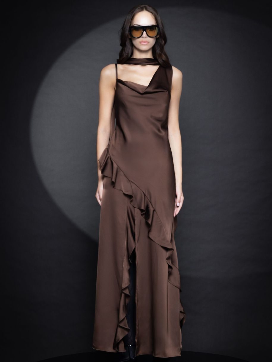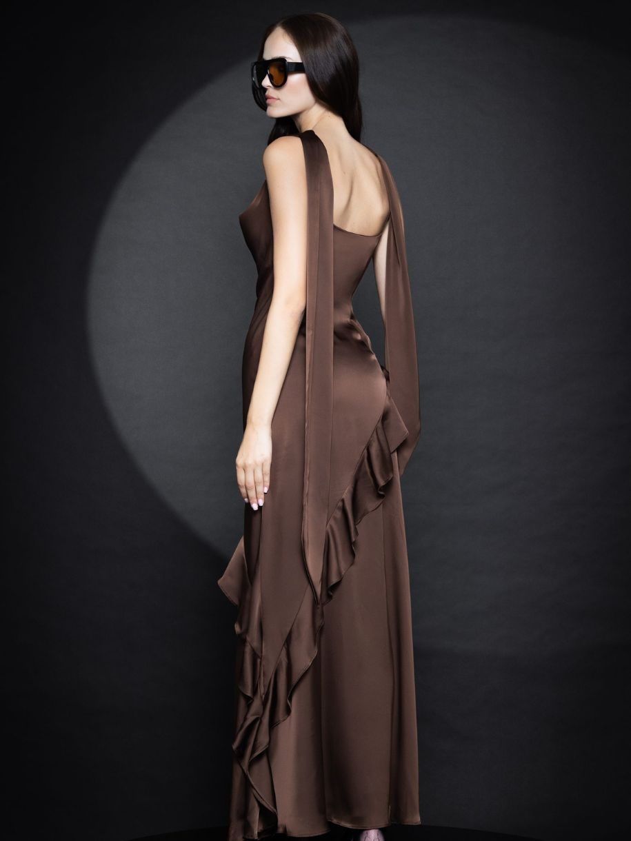 – Maxi φόρεμα με έναν ώμο και βολάν