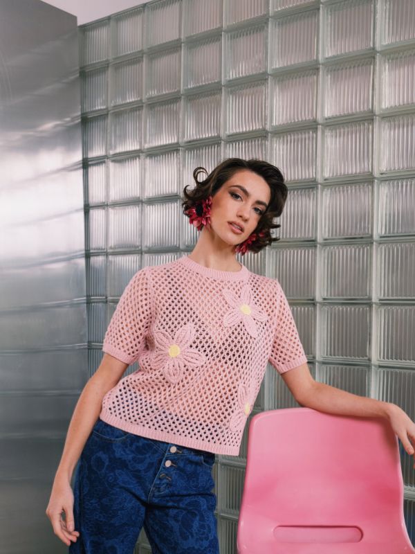 – Πλεκτό τοπ, one size – Μοτίβο από πλεκτά λουλούδια – Καλύπτει έως large – Κοντά μανίκια – Ιταλική κατασκευή